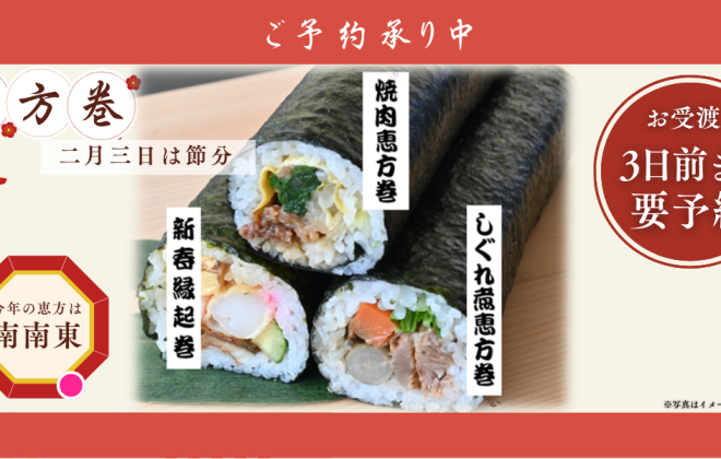 今年の恵方は「南南東」! 金剛閣では、今年も特製の恵方巻きをご用意いたしました。 注目は、…