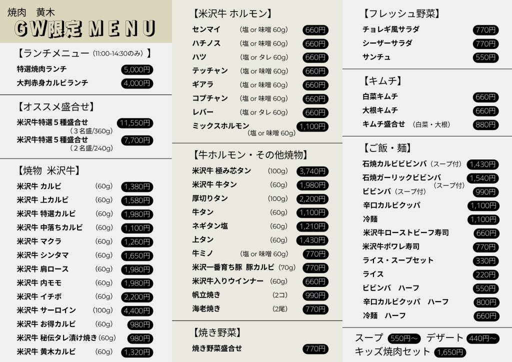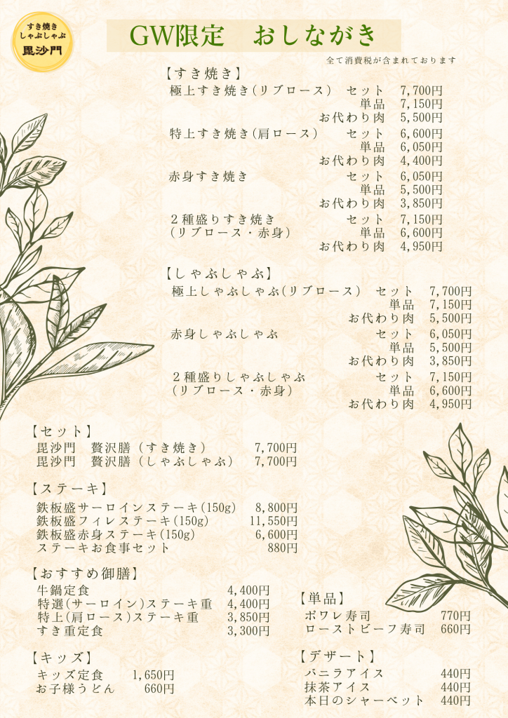 4月29日(祝)~ 5月6日(祝)の期間、通常ランチと一部メニューをお休みさせていただきます。